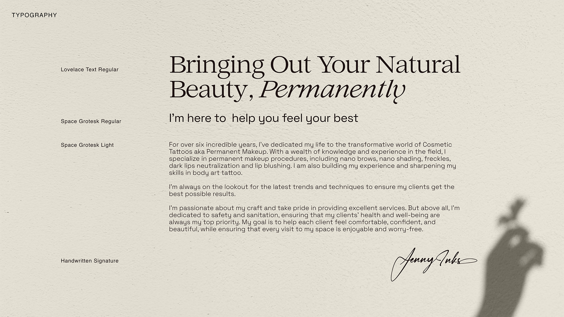 JennyInks is owned by Jenny Chang, a licensed cosmetic & body tattoo artist and mentor in Las Vegas specializing in nano brows, combo shading, faux freckles, lip blushing and tiny tattoo. Jenny sought me out to help her create a new brand identity to be used on her website and social media.